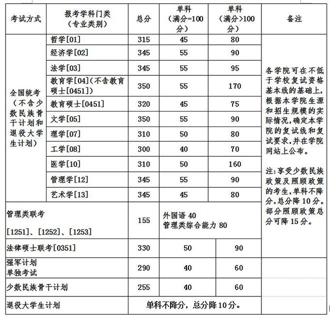 *享受照顾政策考生:参加“大学生志愿服务西部计划”、“三支一扶计划”(支农、支教、支医和扶贫)、“赴外汉语教师志愿者”、“选聘高校毕业生到村任职”、 “农村义务教育阶段学校教师特设岗位计划”项目服务期满的考生,普通高等学校应届毕业生应征入伍服务义务兵役退役后的考生,在三年内参加全国硕士研究生招生考试。其中“选聘高校毕业生到村任职”符合照顾要求的考生,若报考人文社科类专业,复试线可总分降15分。